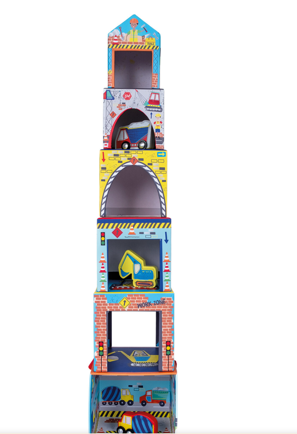 Get ready for endless amounts of fun with Stack & Play. Make a tower, then hide and play using the wooden pieces. Count the numbers on one side, then match up the scenes on the other (either by stacking or laying them side by side). The cool Construction design features diggers, trucks, cement mixers and more. Stack & Play includes 6 stacking cubes, 3 wooden play pieces, 2 on wheels. All parts are stored in the biggest box with a handy carry handle, making it so easy to take around with you! FEATURES: 3 wooden pieces to play with (2 on wheels!) Neatly packs away inside the biggest box Carry handle Fun tunnel features Learn to count/match up the pictures Eco friendly Recommended age: 2+ ECO FRIENDLY BENEFITS: Printed with soy inks Fully recyclable FSC