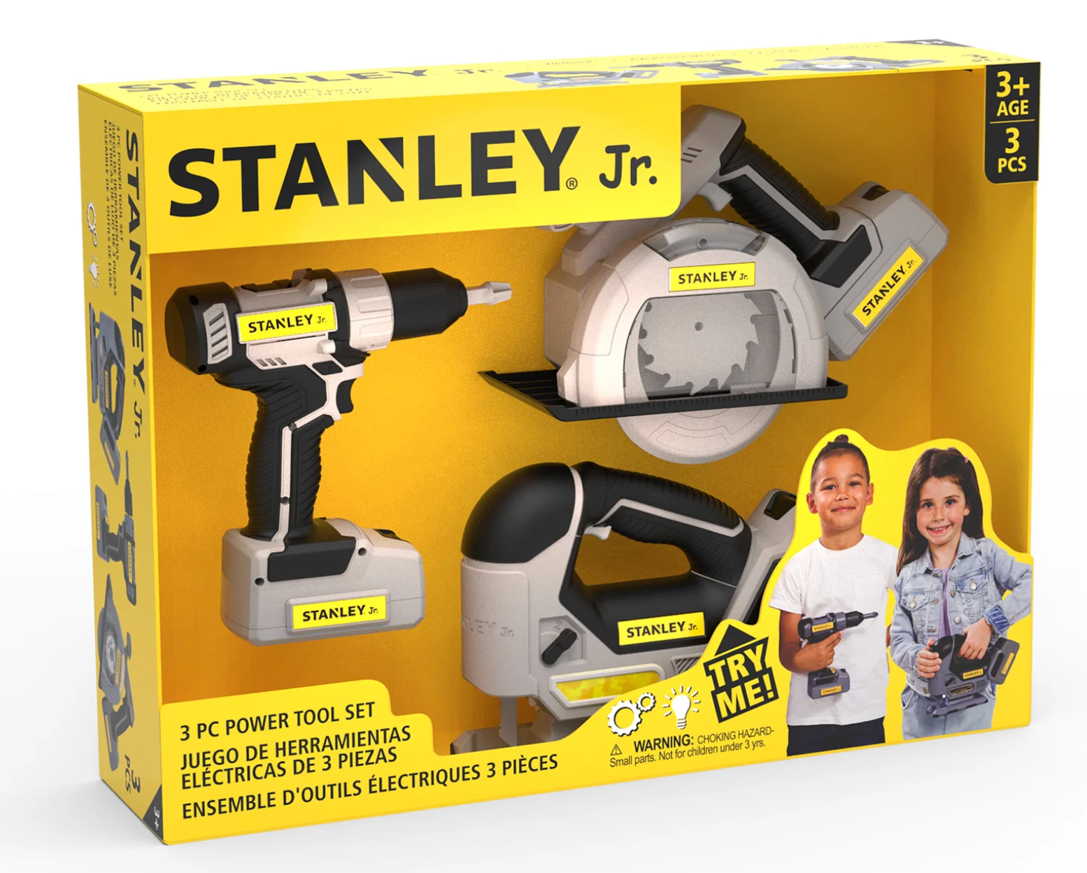 The Stanley Jr. Power Tool Set includes three battery-operated tools including a drill, circular saw, and jigsaw designed with realistic sounds and action to engage young builders. Each tool is sized for kids and crafted for safe pretend play.