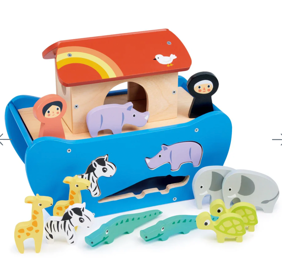 This set includes the boat, Mr and Mrs Noah, 2 Rhinos, 2 Giraffes, 2 Zebras, 2 Crocodiles, 2 Tortoises and 2 Elephants, with their corresponding shapes cut out of the hull of the boat. Roof panels are decorated with a rainbow and a rain cloud.