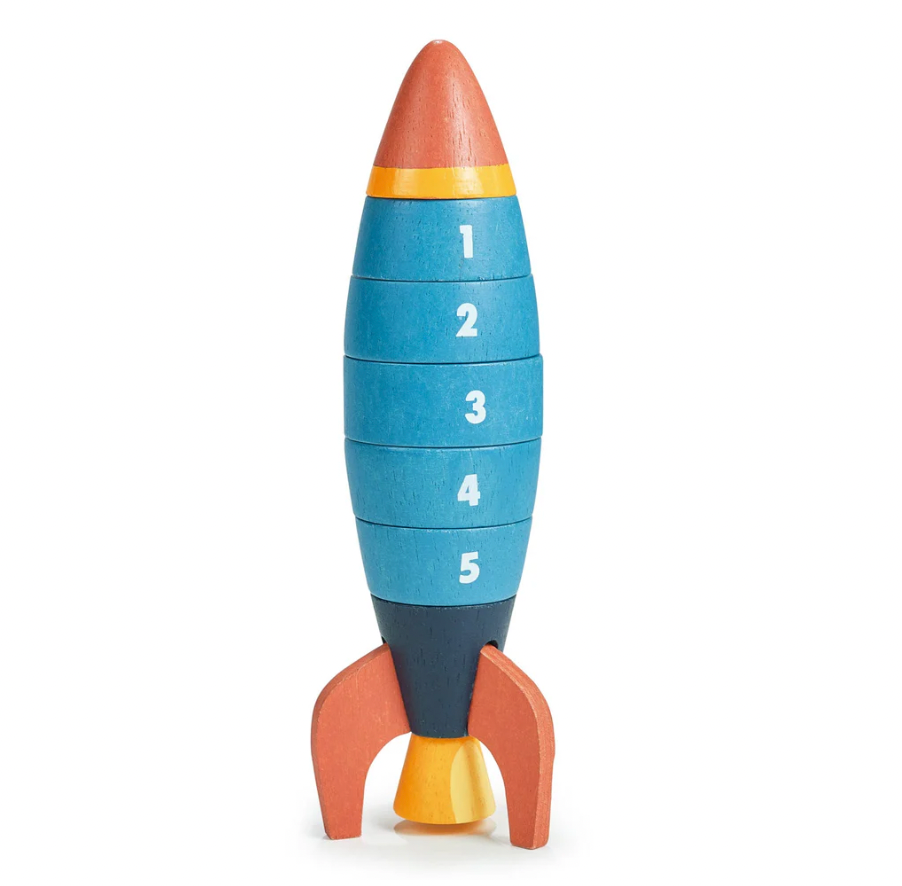 A classic stacking ring toy that involves both stacking and shape matching pieces in the correct order to form a colourful rocket. If assembled correctly, the numbers will read 5, 4, 3, 2, 1 from the bottom up, and each ring has the corresponding number of stars printed on the back.
