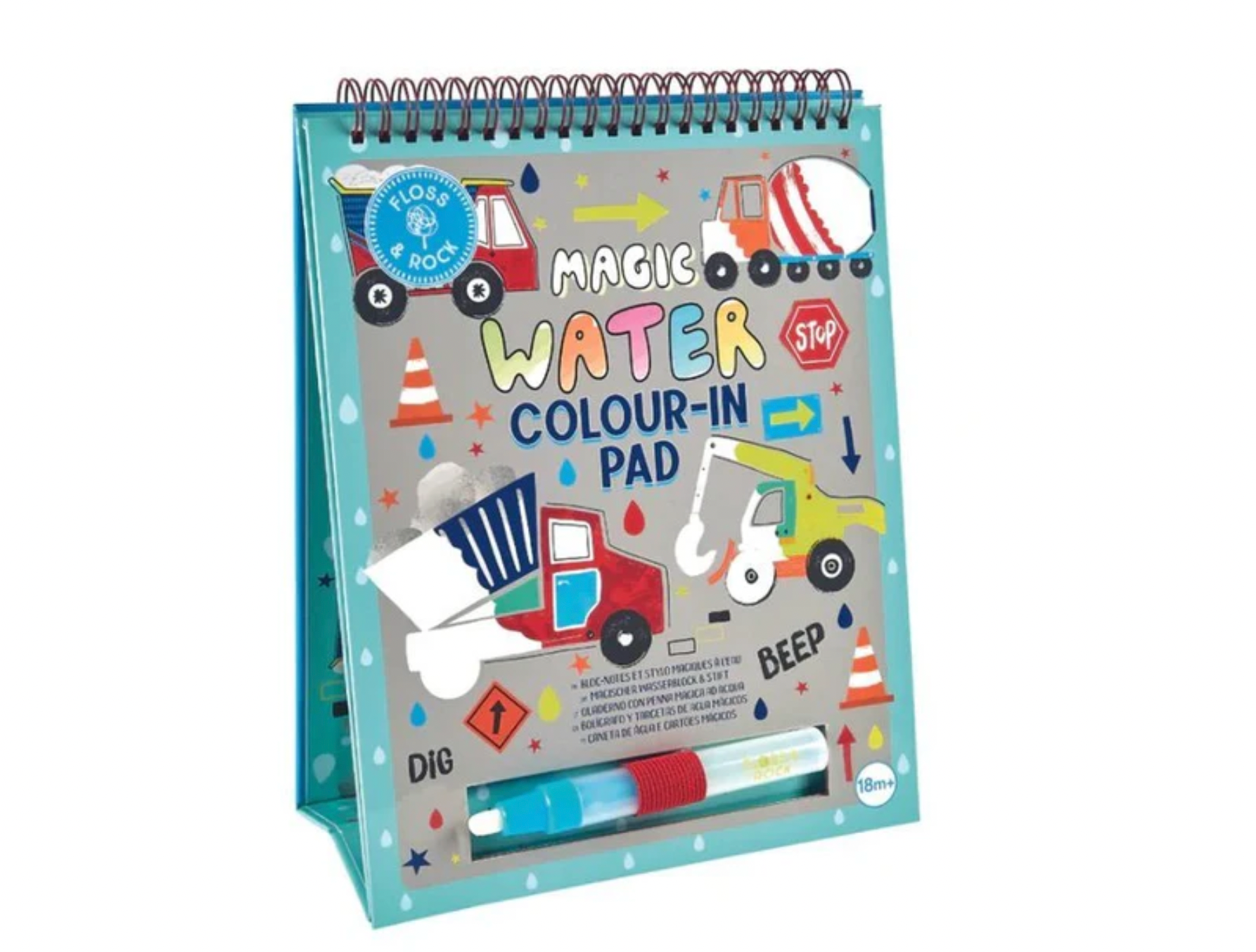 Another brilliant magic color-in pad from Floss & Rock--this time with a construction theme. Multiple fun packed sheets held together in a flip-over spiral bound pad which doubles up as an easel for busy little artists! Fill the special pen with water and color to uncover fun construction scenes. Can be used over and over again--once the water dries the colors disappear ready for next time. Perfect for on-the-go fun without worry about the mess.