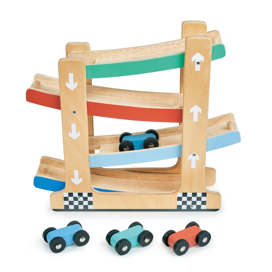 This classic wooden car ramp racer toy is a great game to play with friends. Made from solid wood, the 4 little coloured cars are designed to flip over on to each level as they zoom down the track.